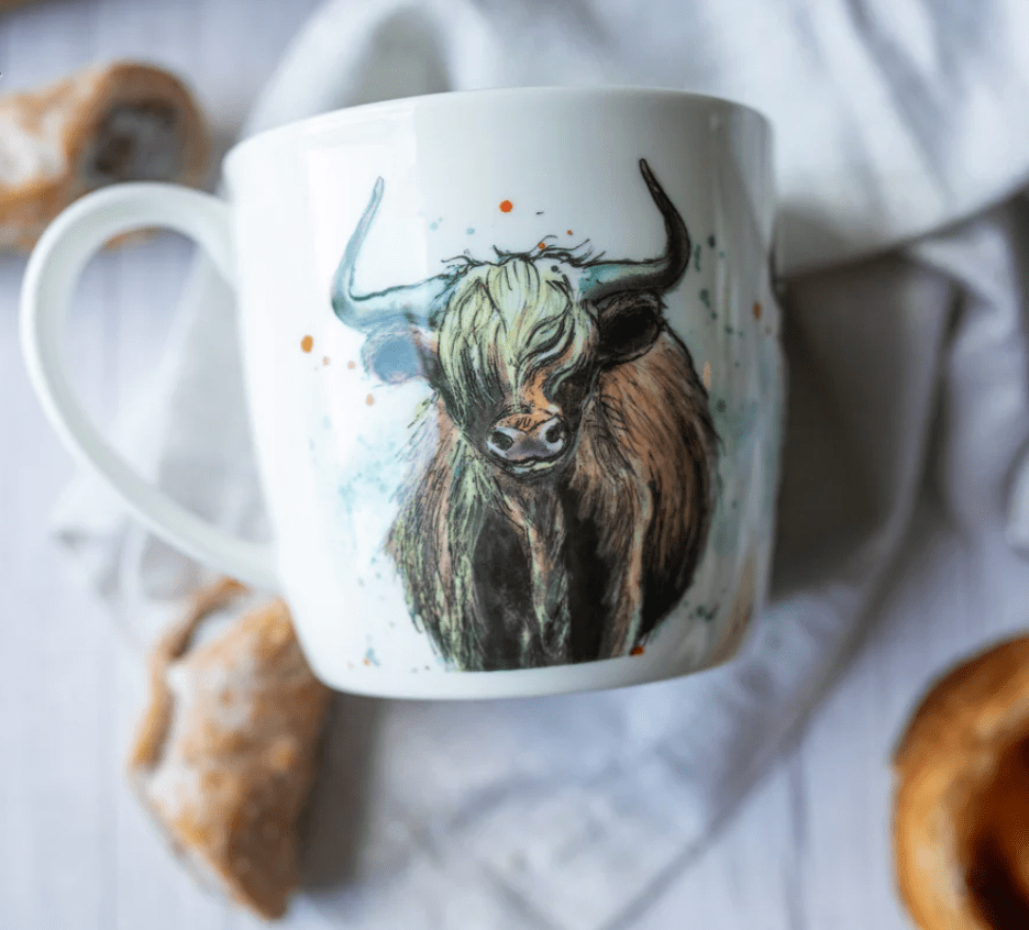 Beautiful Fine china mug with Highland Cow design and small print detail on the inside. Designed and made in the UK.