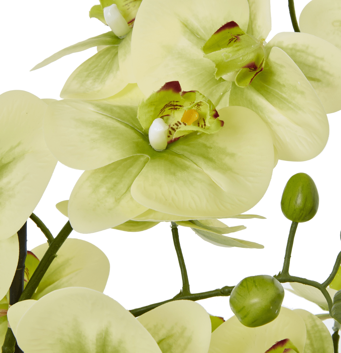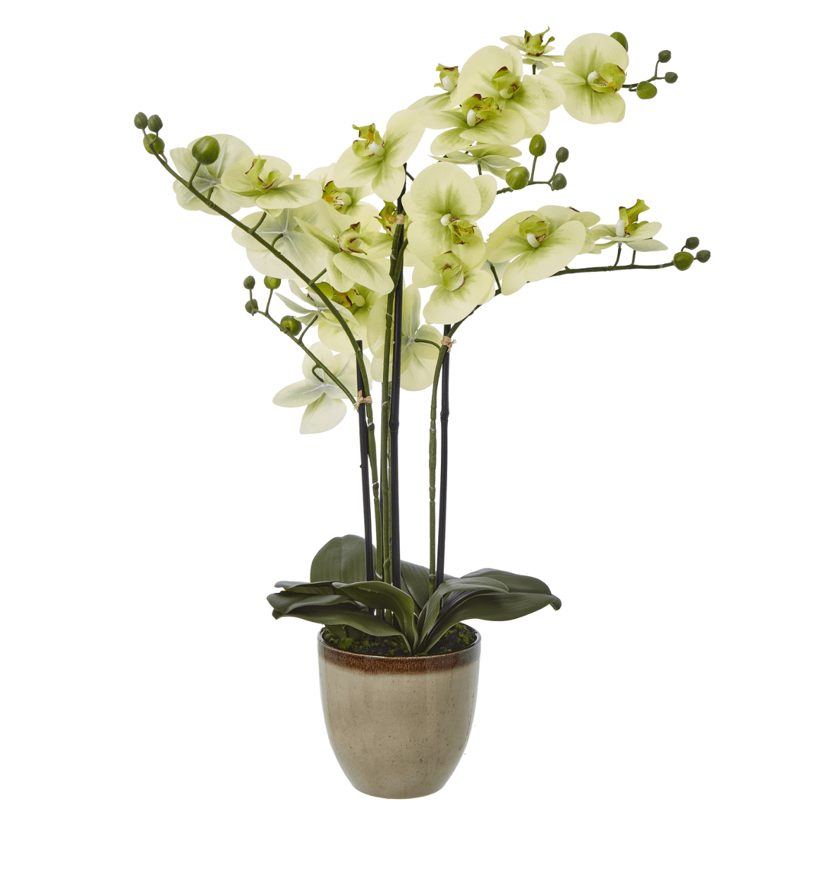 This striking faux orchid arrangement features delicate, creamy phalaenopsis blooms cascading gracefully from sturdy stems, creating a natural and elegant display. Crafted with meticulous attention to detail, each petal and leaf is expertly sculpted for botanical perfection. Set in a beautiful ceramic pot, this arrangement adds an earthy contrast that complements modern minimalist to traditional interiors with ease.